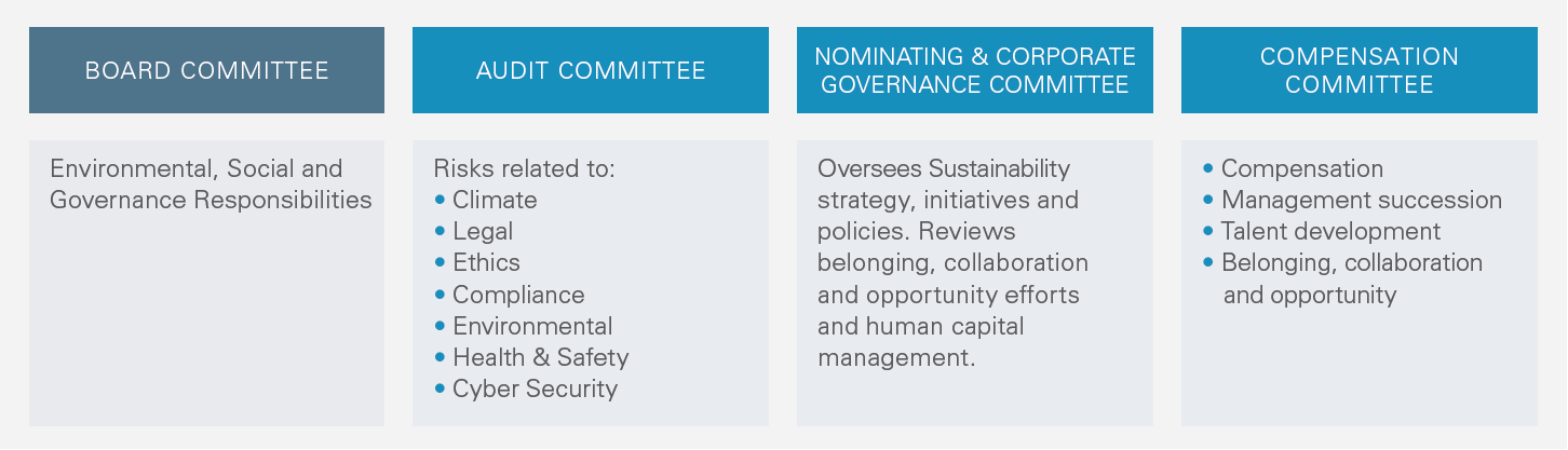 Prioritized risks are escalated to the relevant Board committee or the full Board for targeted oversight. Directors routinely evaluate matters related to credit, liquidity, market conditions, legal and regulatory developments, compliance, operational performance, sustainability initiatives, technology, and cybersecurity. These reviews ensure strategic alignment and informed decision-making. For additional detail on our risk oversight and exposure, refer to our Annual Report on Form 10-K and the FY25 ESRS disclosure report.