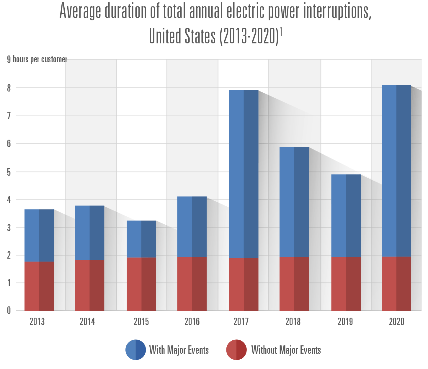 1) U.S. energy Information Administration, 2021, Today in Energy, Viewed 8/1/2022, www.eia.gov/todayinenergy/U.S.-electricity-customers-experienced-eight-hours-of-power-interruptions-in-2020