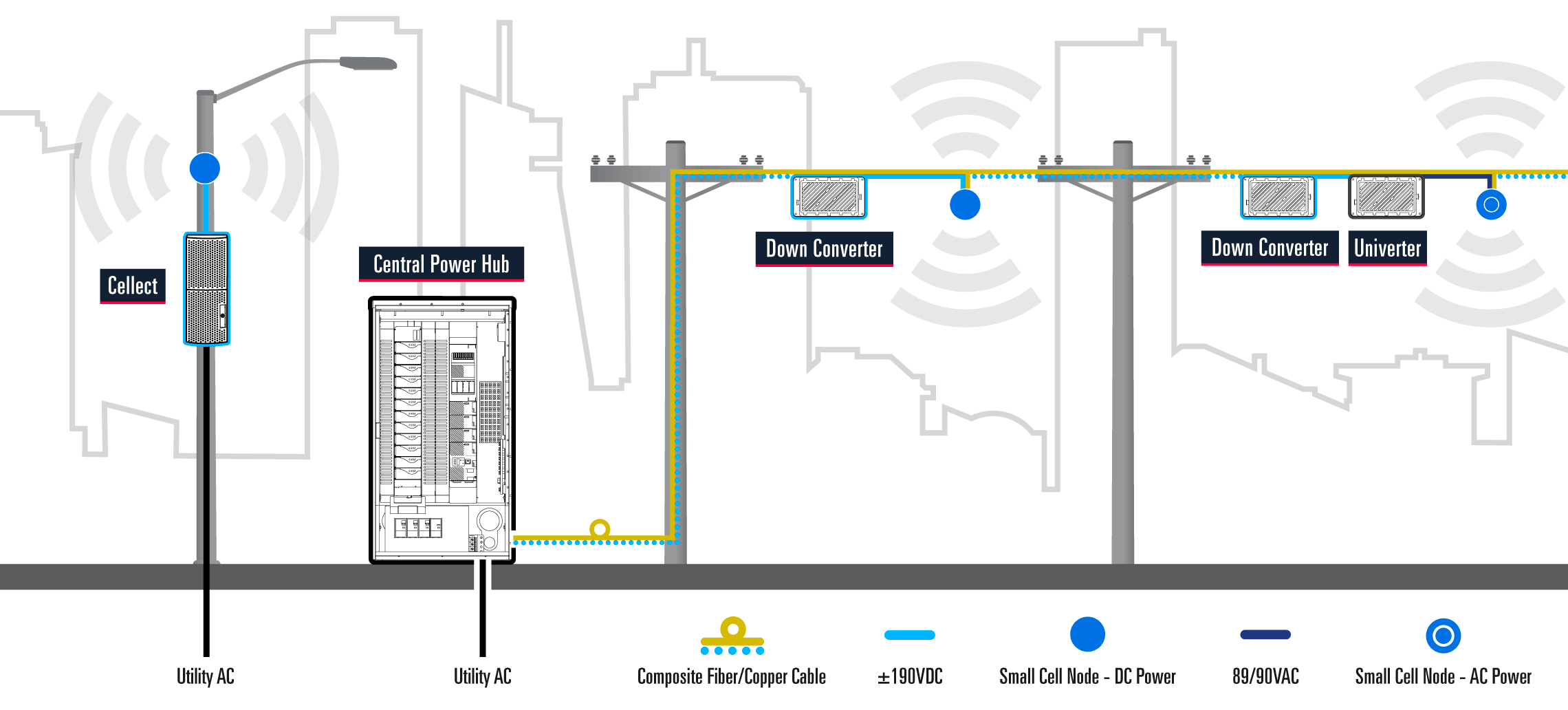 When electricity is not available at the site, our LPS36 line power system energizes small cells by delivering power over copper cables. Installing the copper cables with the fiber backhaul lines provides a simple means to feed power to the small cell sites. Our centralized power hub makes a single connection to the grid, then distributes converted power over the copper lines to a downconverter that supplies a voltage that matches the small cell’s requirements. For DC powered radios, the downconverter output connects directly to the small cell. For AC powered devices, our Univerter converts the voltage to AC.